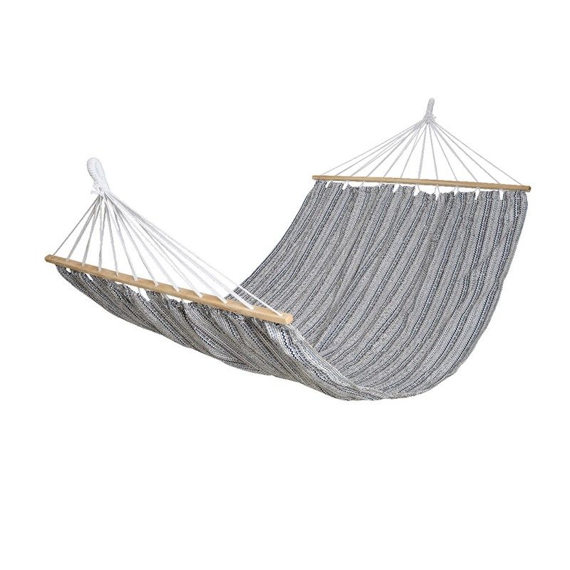 Hamaca 150x200cm de algodon con barra colgante de madera de abedul. Rallas azules verticales